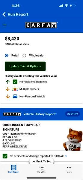 Vehicle Inquiry for 2000 Lincoln Town Car Signature